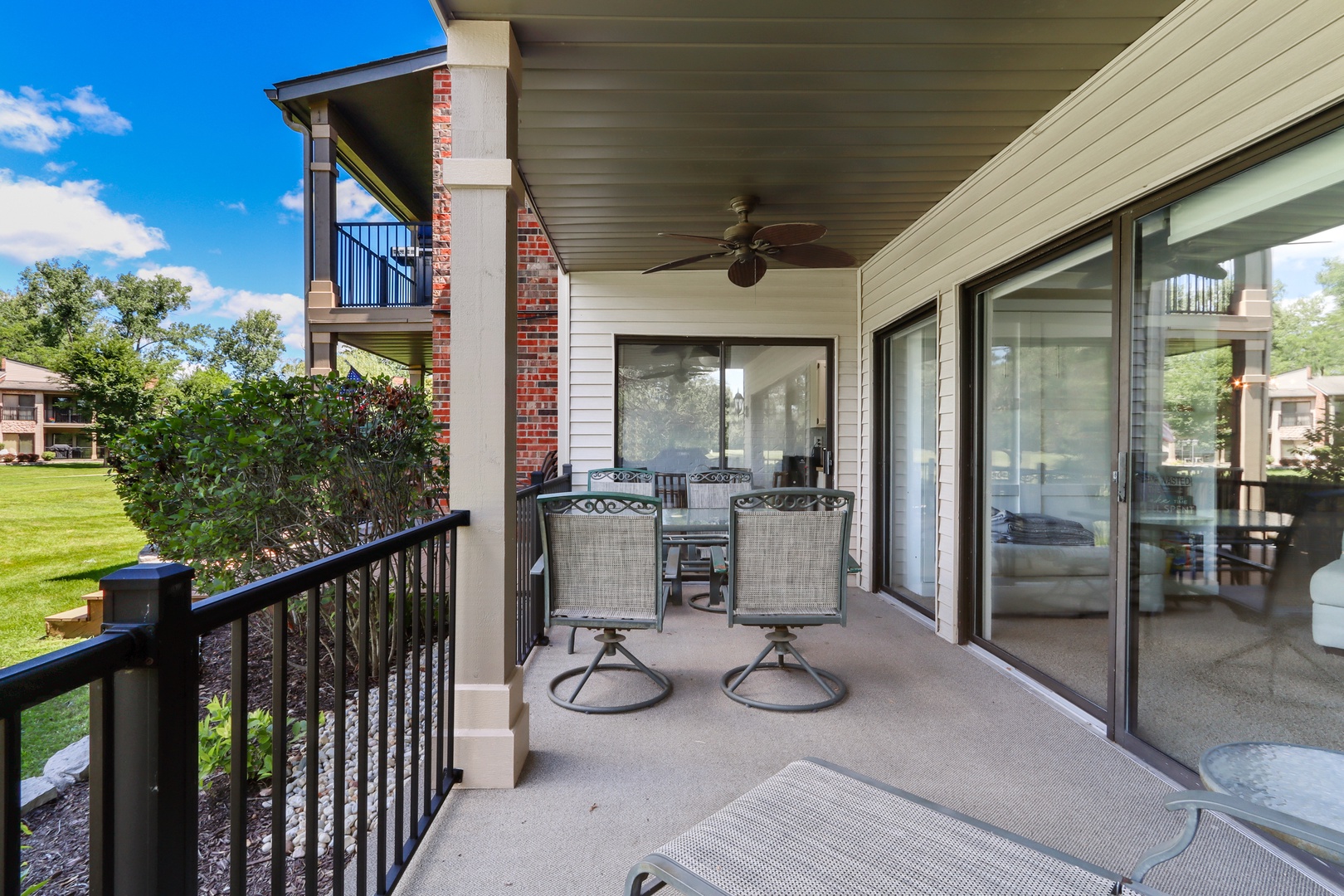 Incredible corner unit with wall-to-wall oversized, soundproof glass doors spanning the west side of the condo from the living room through the dining area. There are new remote shades to provide privacy. Relax in the cozy seating around the gas fireplace and Smart TV. Sliding doors open to two separate patios, one covered with ceiling fans to enjoy a BBQ or take in the lovely landscaping. Dine in the kitchen or the formal dining room. Meals at home are easy in this well-equipped galley kitchen with updated appliances. There is a stackable washer/dryer for your convenience.