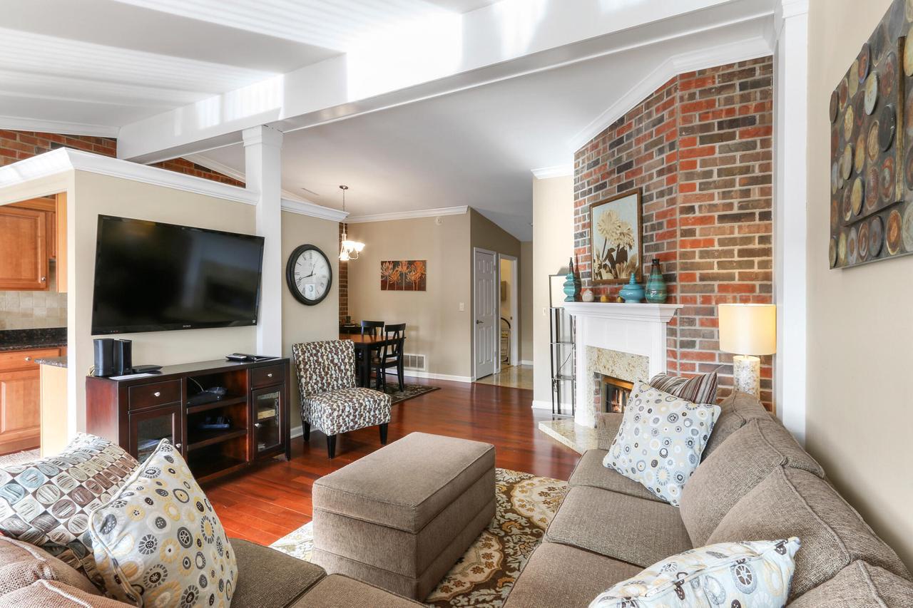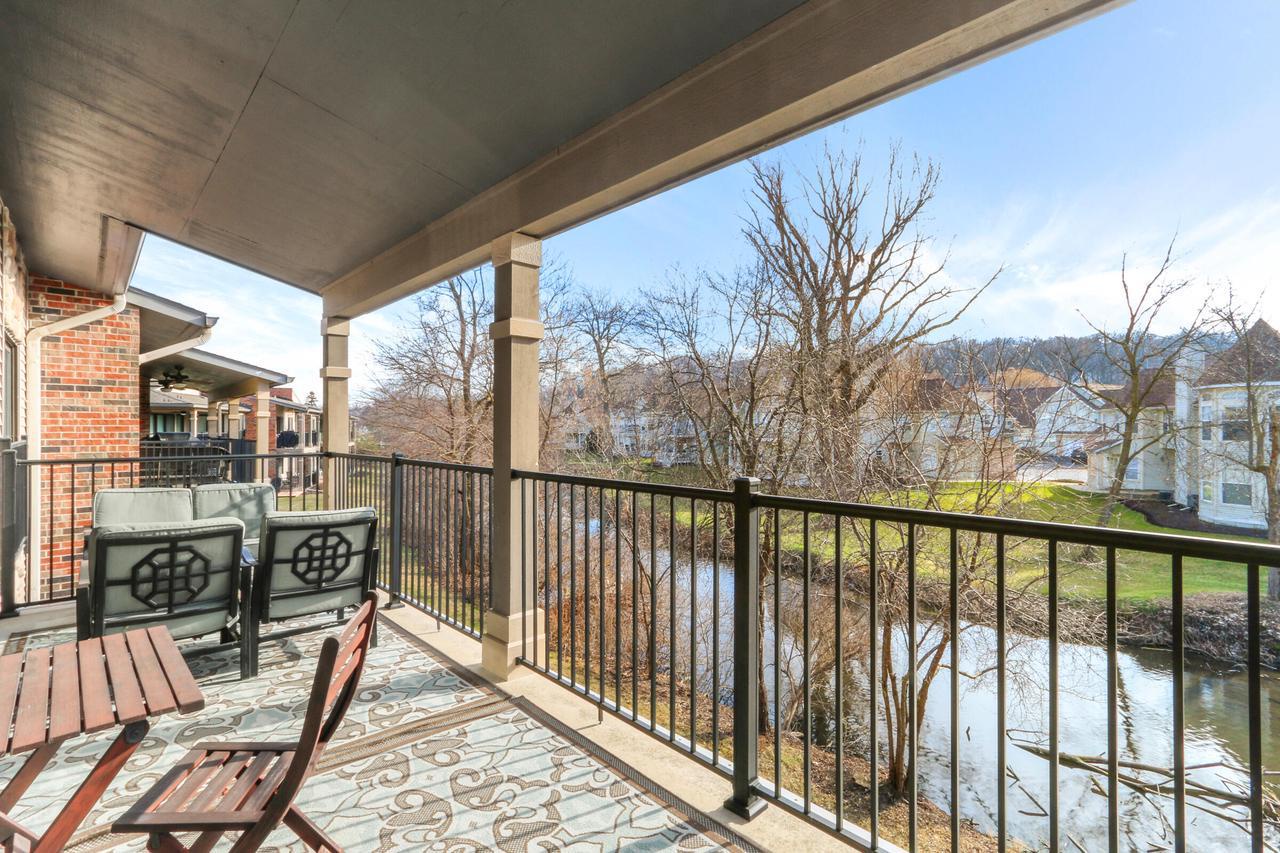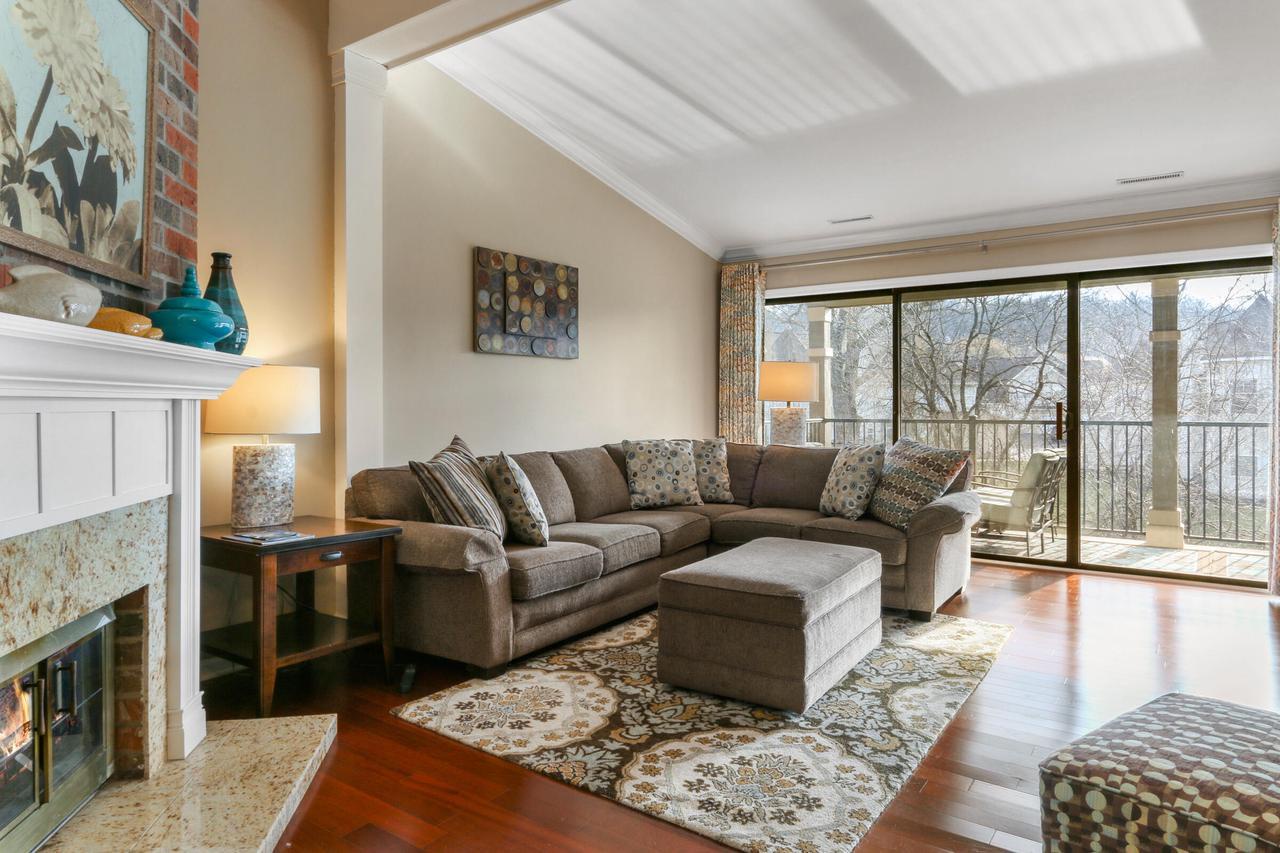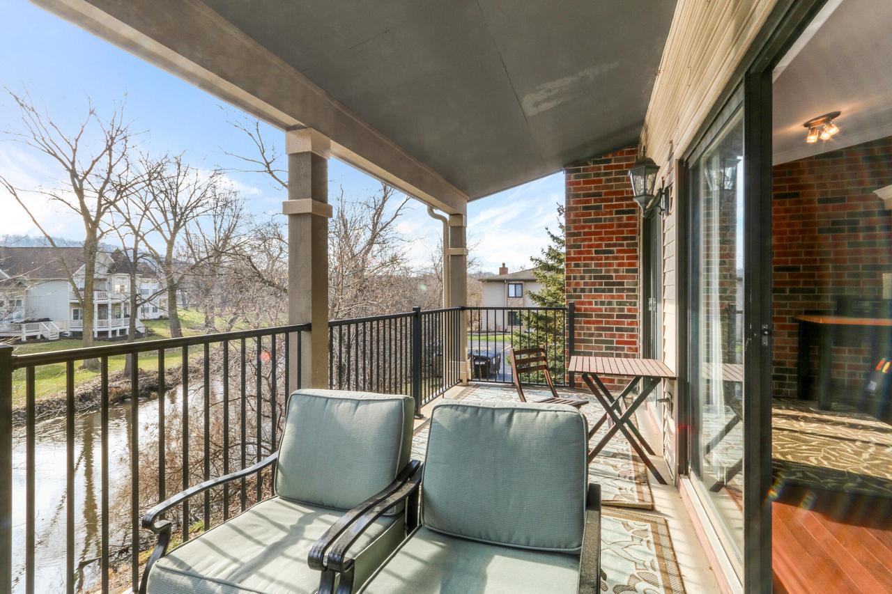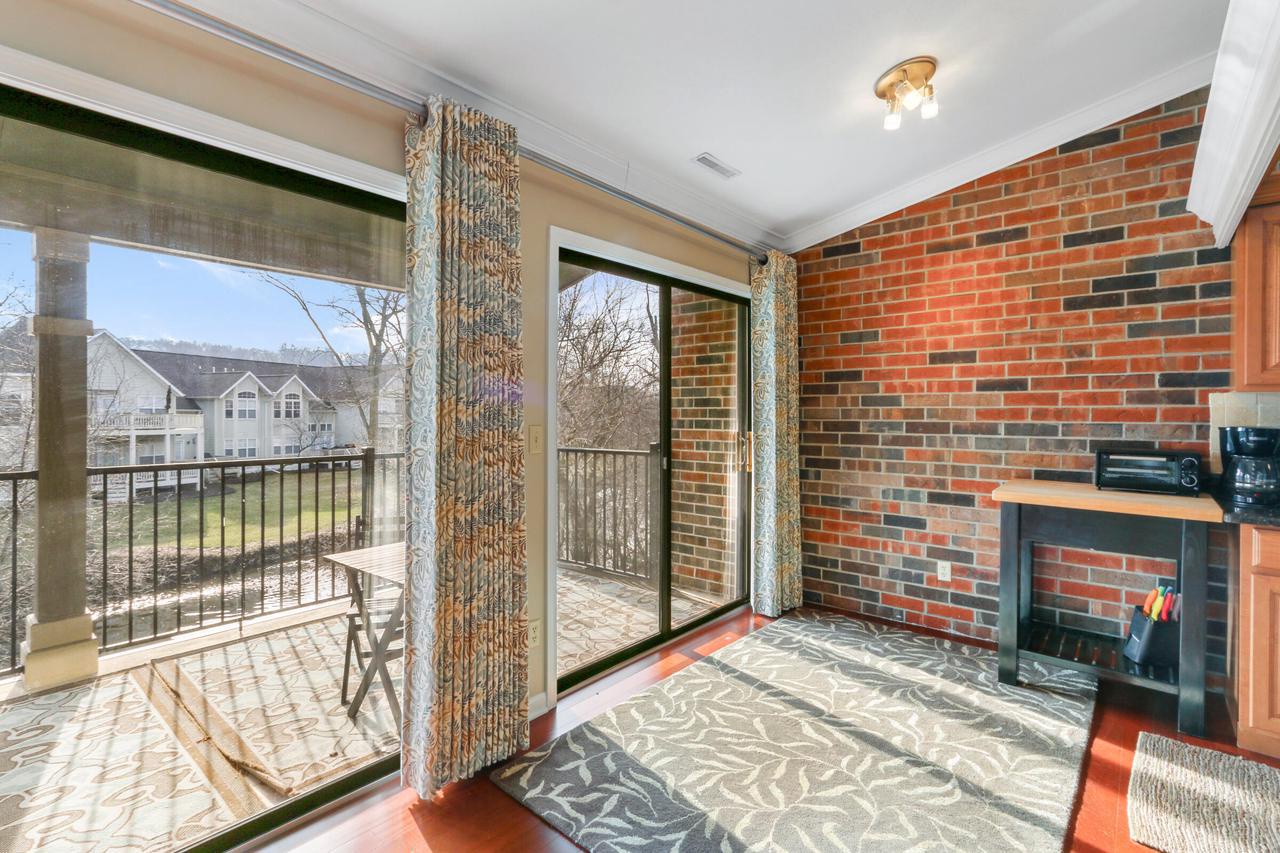 The great room with vaulted ceilings includes the kitchen and dining areas- perfect for entertaining and relaxing! Lovely gas fireplace and comfortable seating for streaming your favorite shows on the Smart TV. Enjoy a BBQ on the electric grill. Sliders from both the master and great room open up to a large balcony overlooking the natural landscape and creek- great for warm summer mornings/nights, taking in crisp fall hues, or looking out at a winter wonderland!