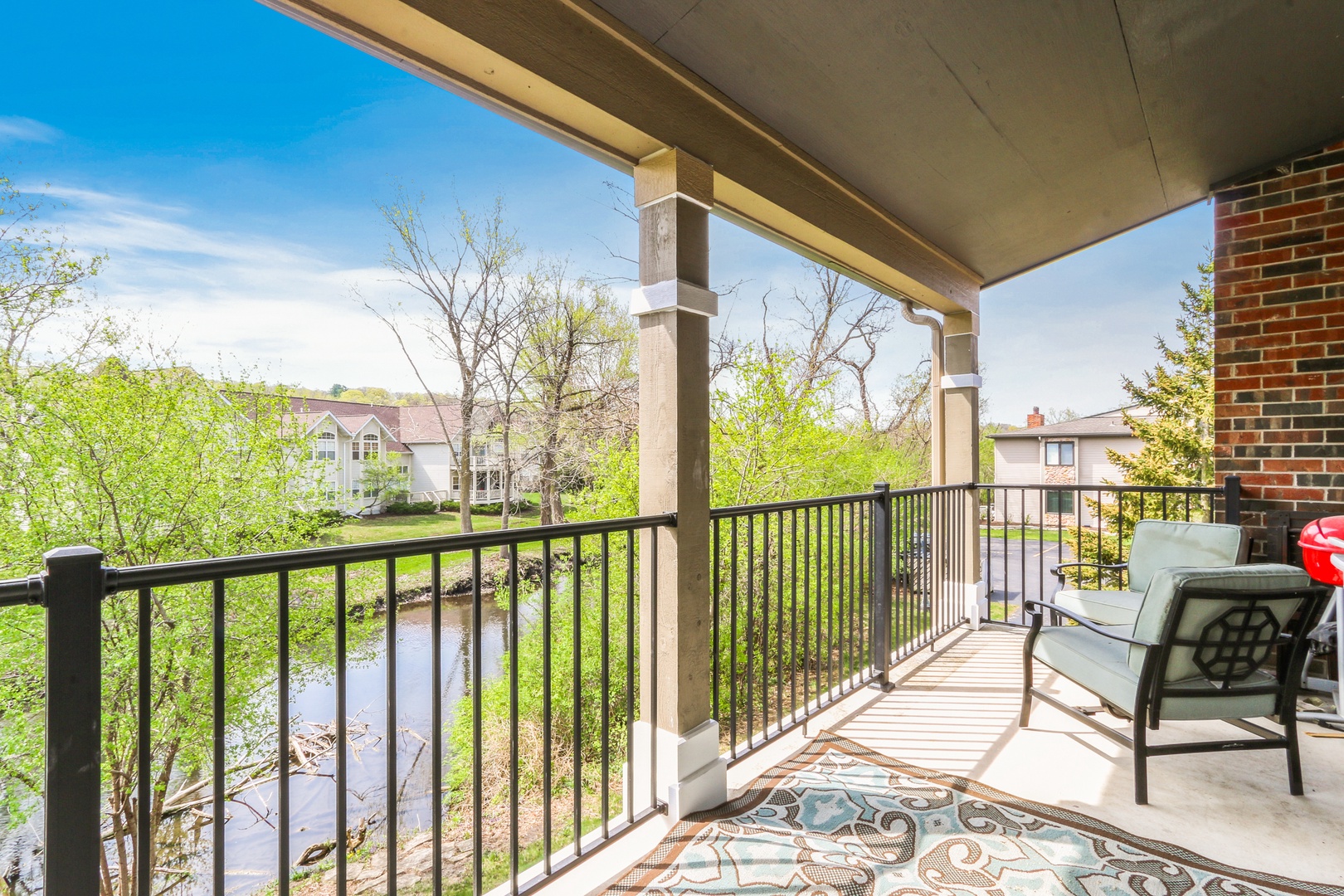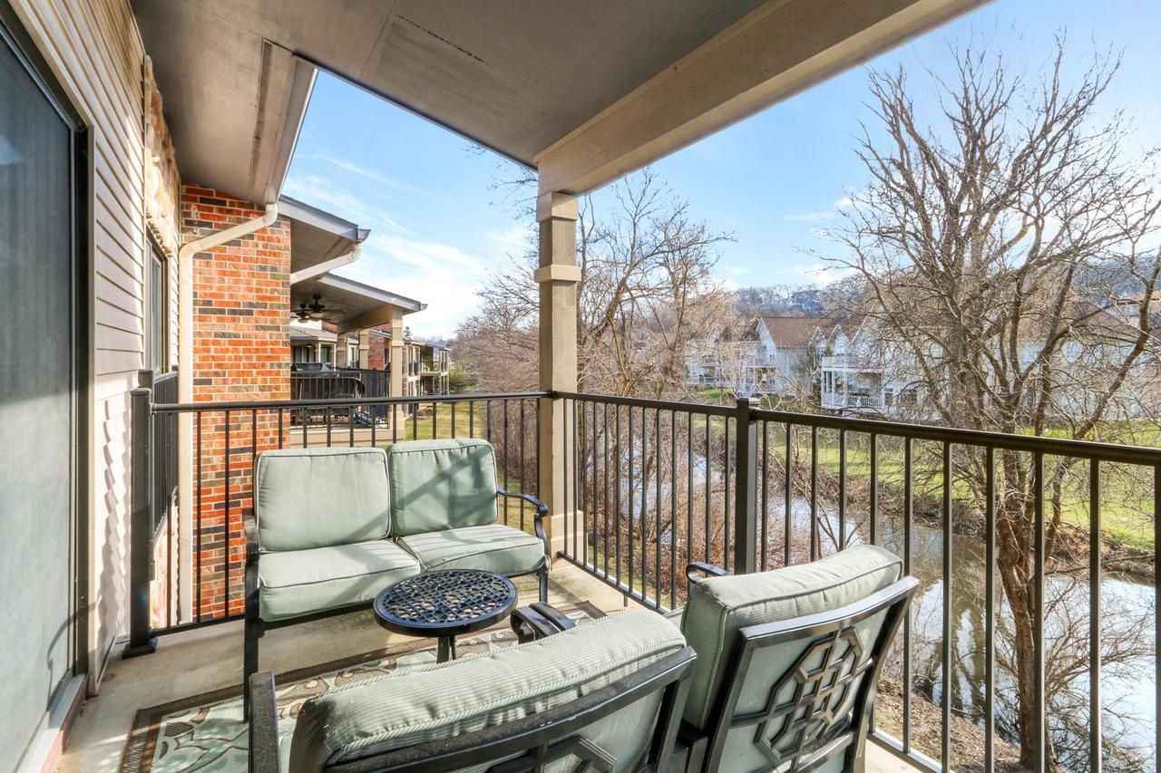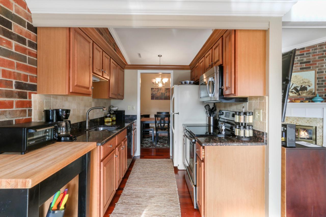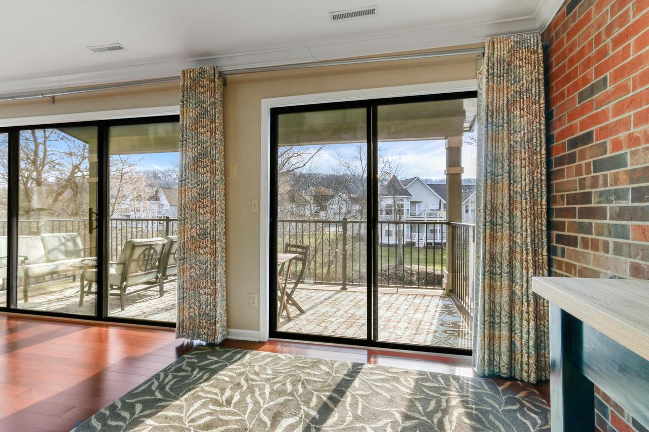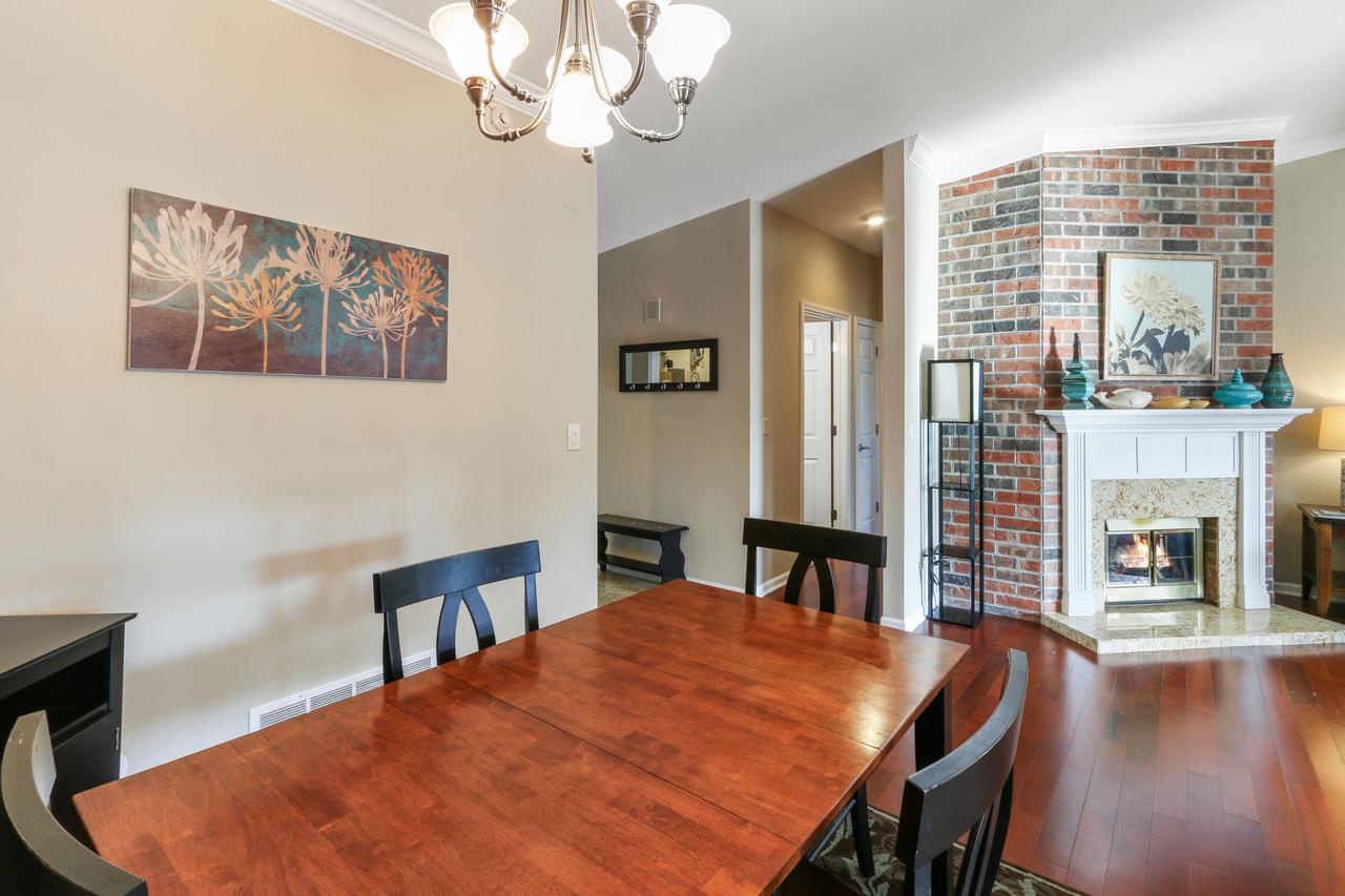 The great room with vaulted ceilings includes the kitchen and dining areas- perfect for entertaining and relaxing! Lovely gas fireplace and comfortable seating for streaming your favorite shows on the Smart TV. Enjoy a BBQ on the electric grill. Sliders from both the master and great room open up to a large balcony overlooking the natural landscape and creek- great for warm summer mornings/nights, taking in crisp fall hues, or looking out at a winter wonderland!
