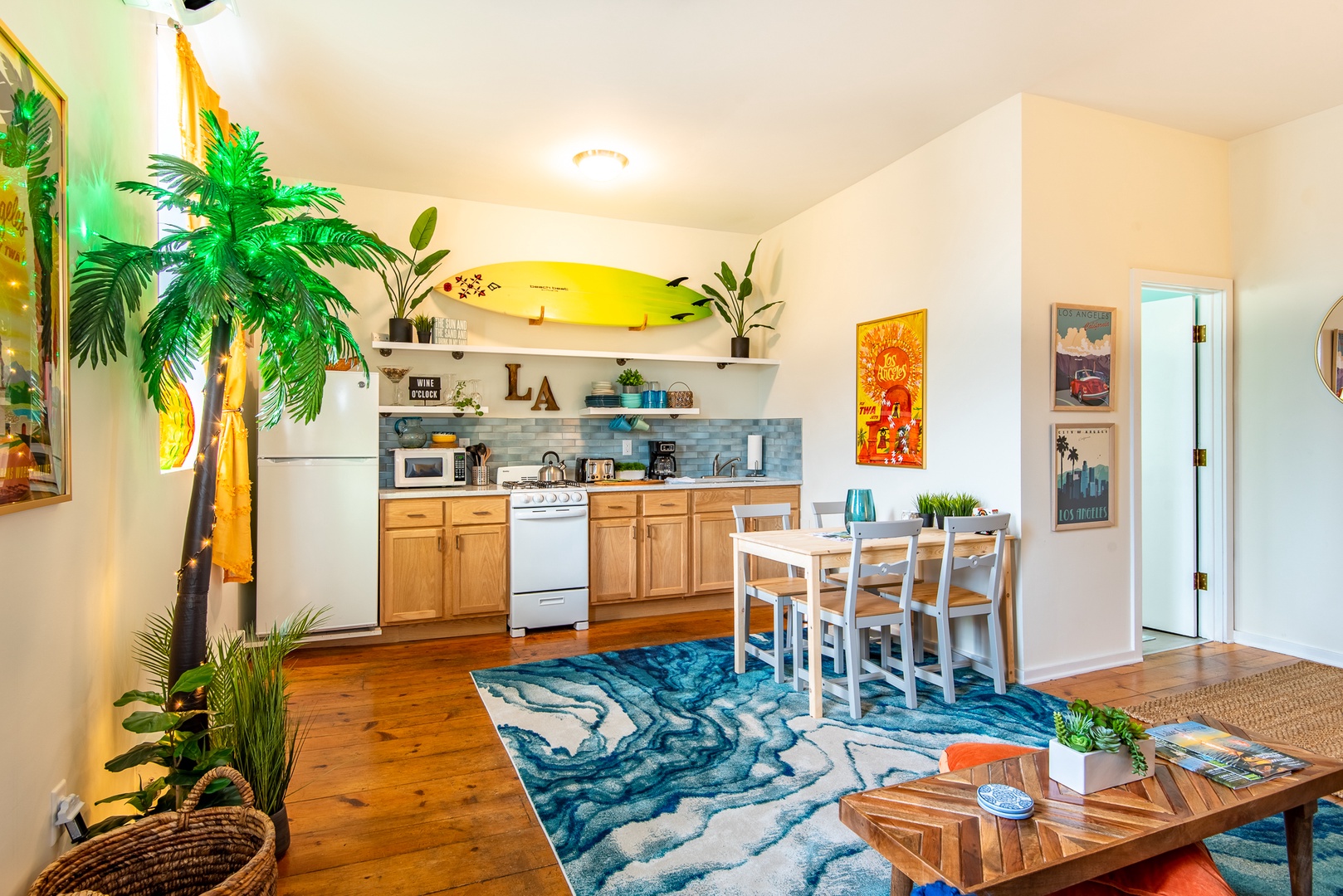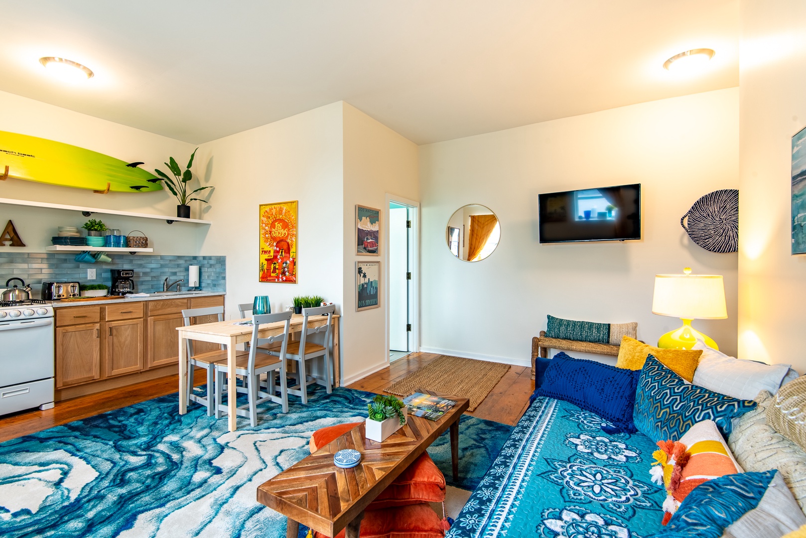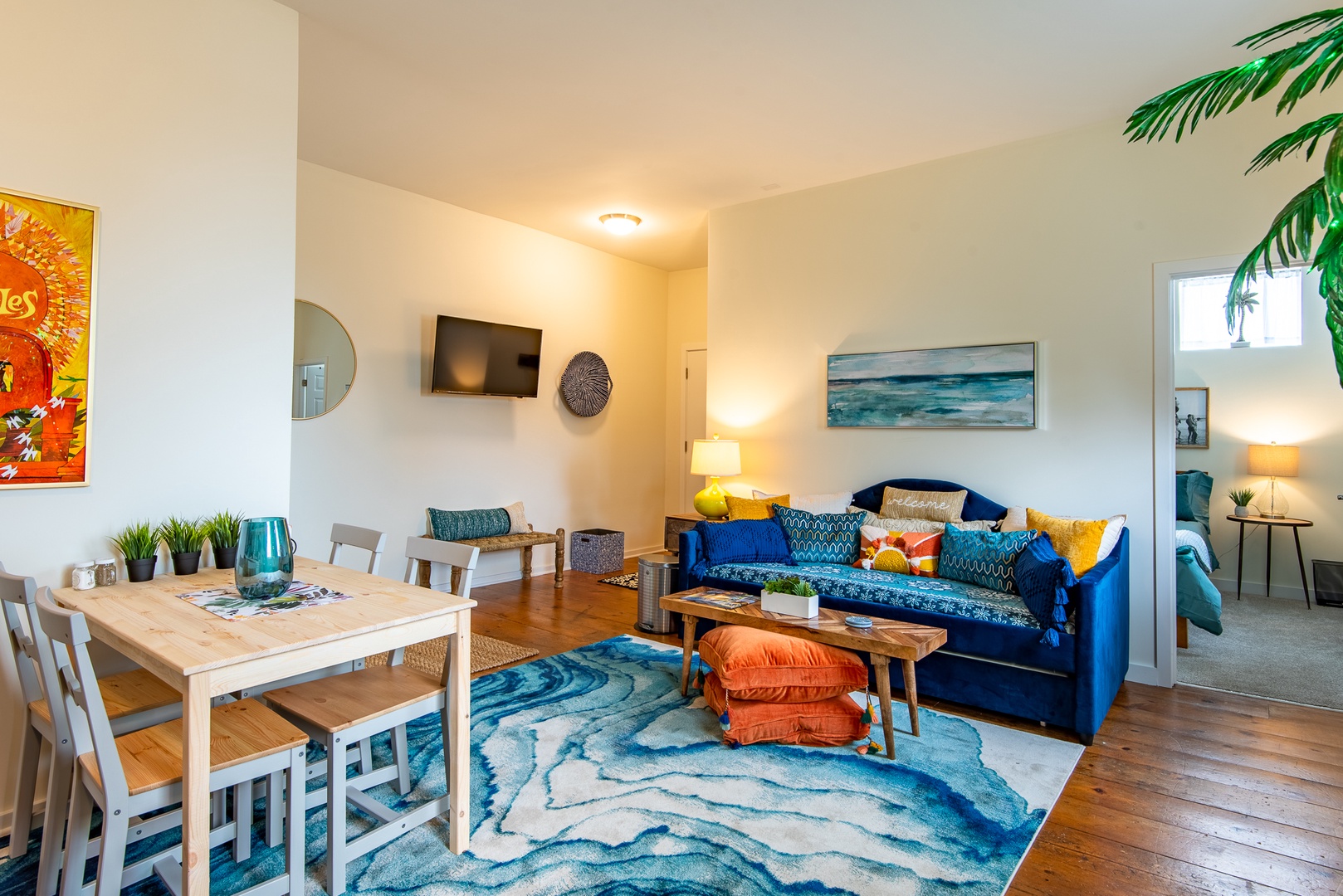 You won't want to miss this fun suite with a Cali vibe! Located in the center of all of the downtown Lake Geneva action, this unit could not be more accessible to boat rentals, Riviera beach, the lake path, and all of the popular LG restaurants and boutiques. Enjoy the simplicity of on-site parking, skip the downtown parking headache and walk everywhere with ease! Featuring one bedroom, a living room with a pull out twin daybed/trundle and one full bath, this unit is best fit for groups up to four.