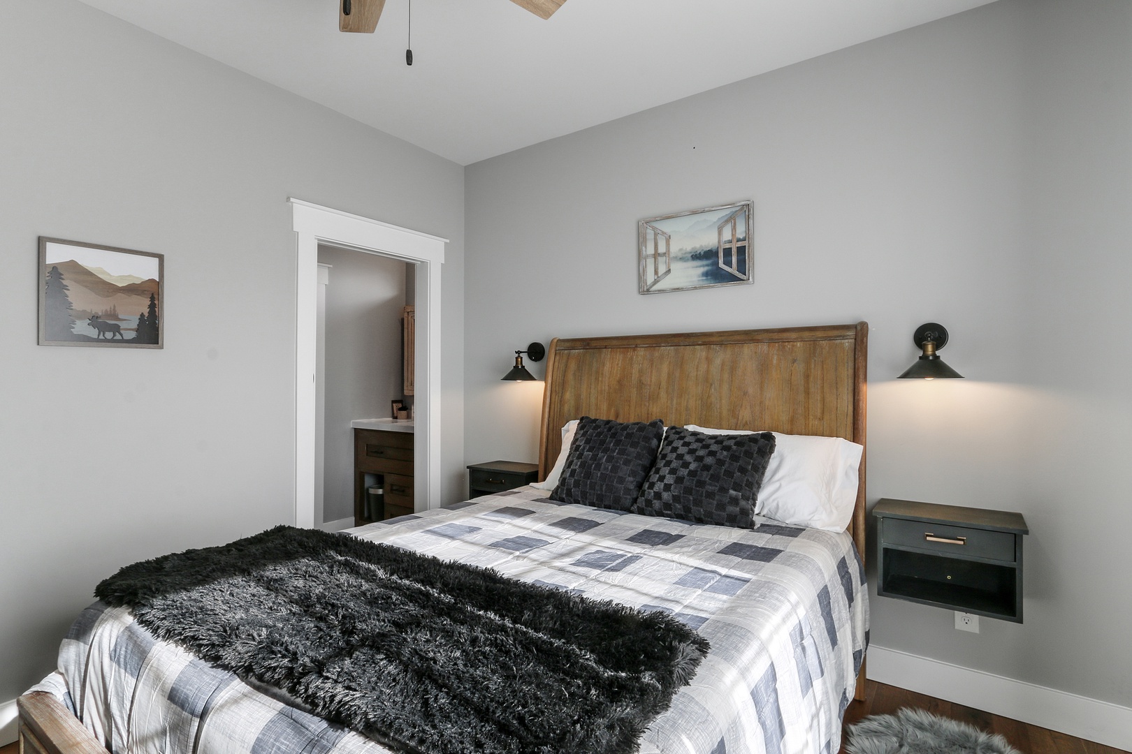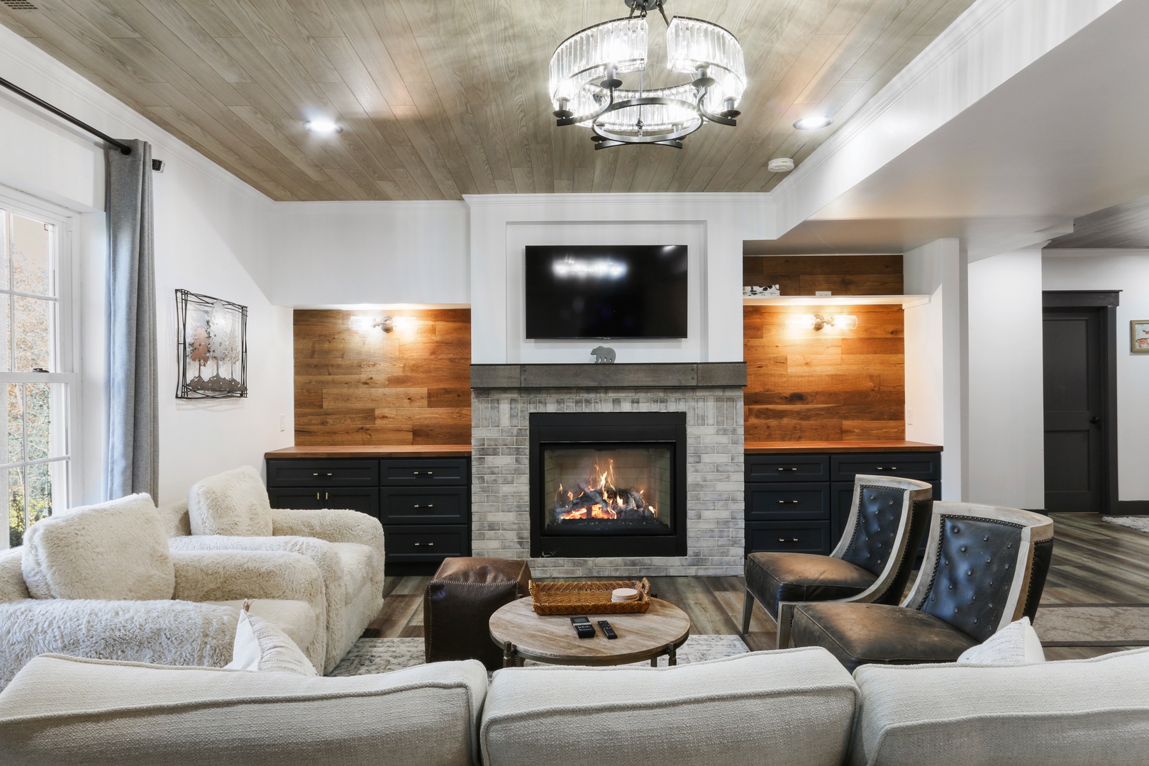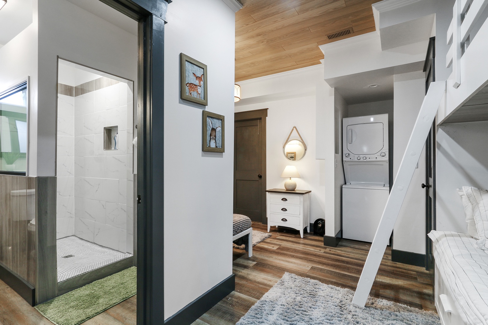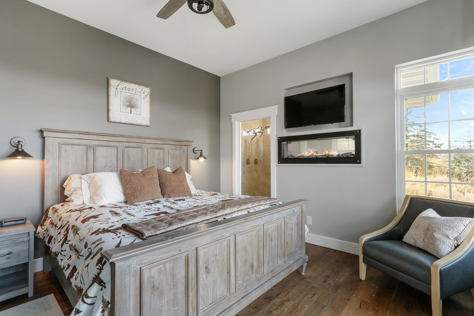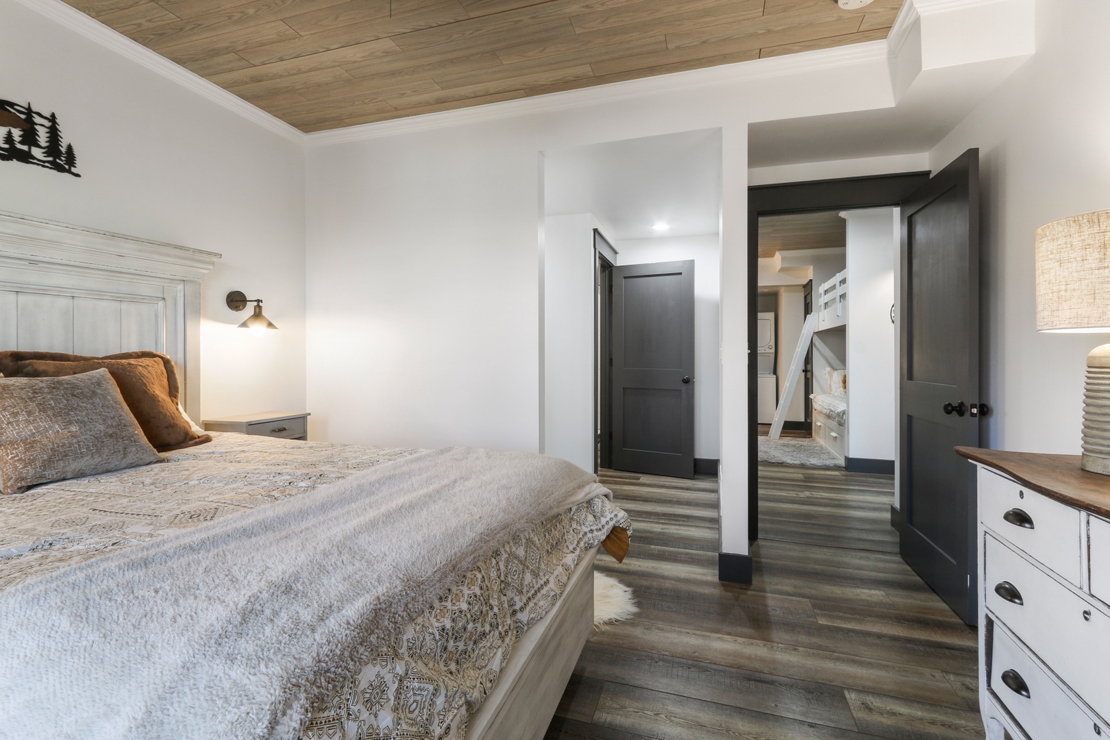 The luxurious primary suite (K) features a tray ceiling, fireplace, a large walk-in closet, and a deluxe bath with a jacuzzi tub and walk-in shower- a true relaxation zone. Two additional bedrooms (Q) on the main floor are adjoined by a convenient jack-and-jill bathroom, while the lower level hosts a secondary master suite (K), a kids room (no door, built-in bunk + twin), and a final bedroom (Q) with a shared attached bath. The proximity of a full bathroom relative to any given bedroom in this home is one of the attributes that sets it apart and makes vacationing at Lookout Lodge a breeze.