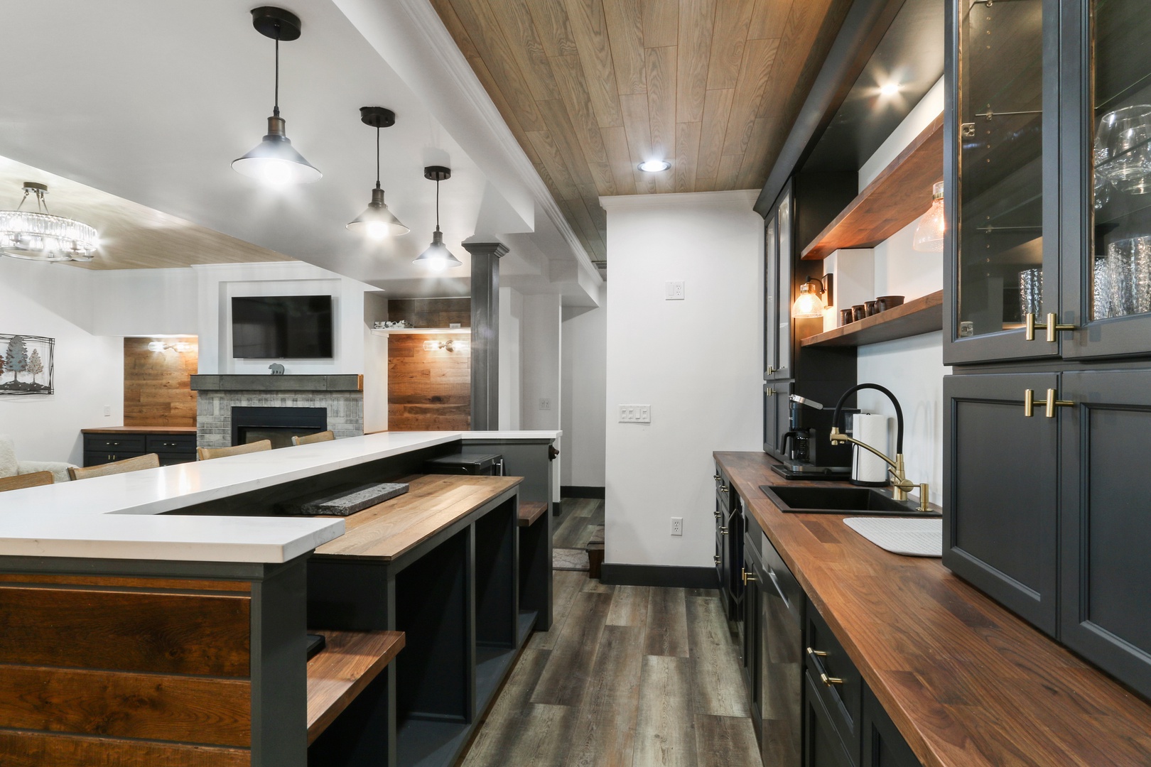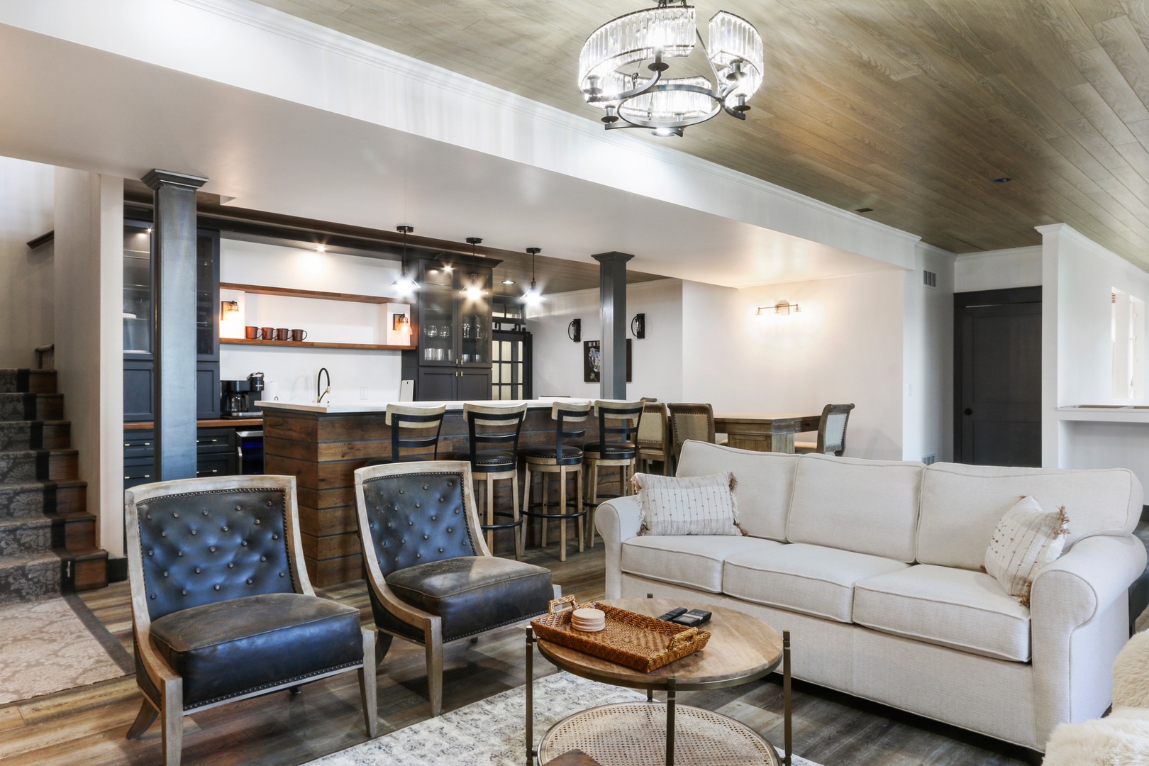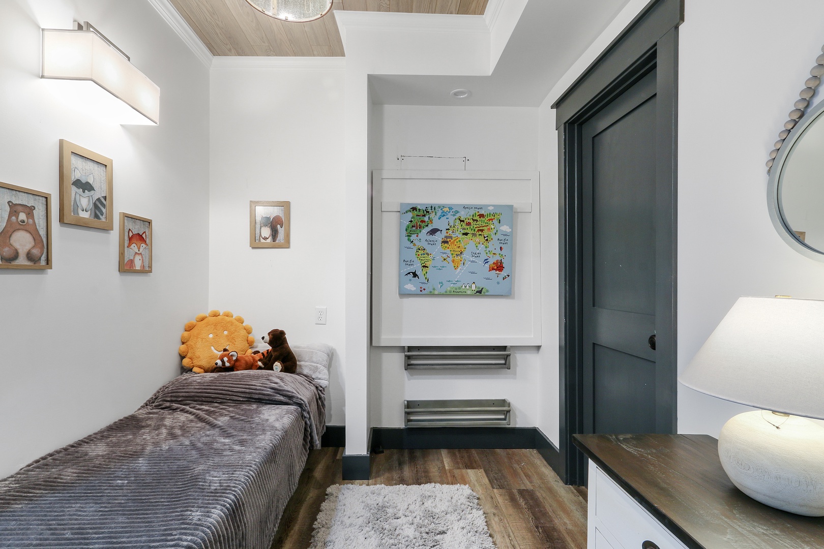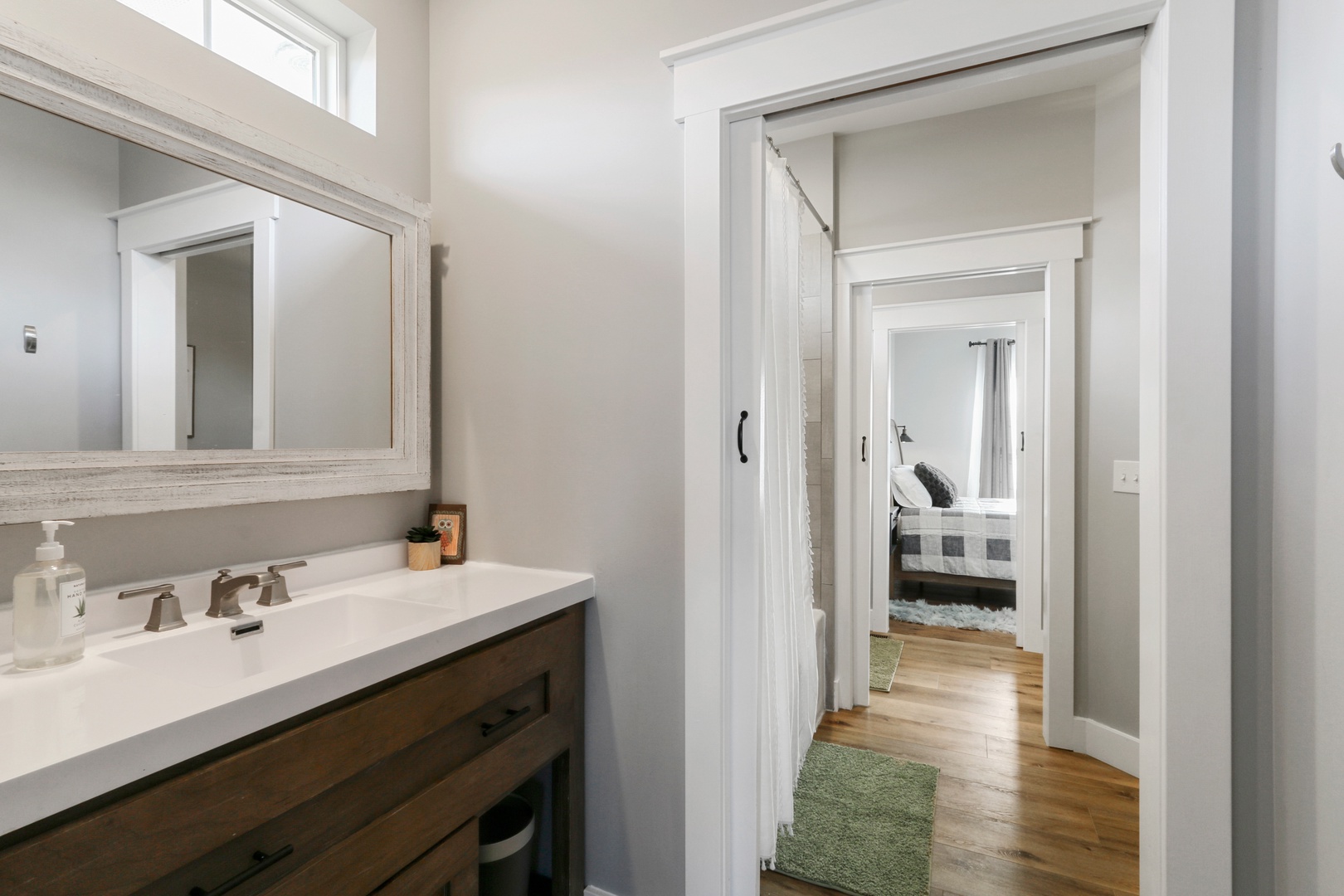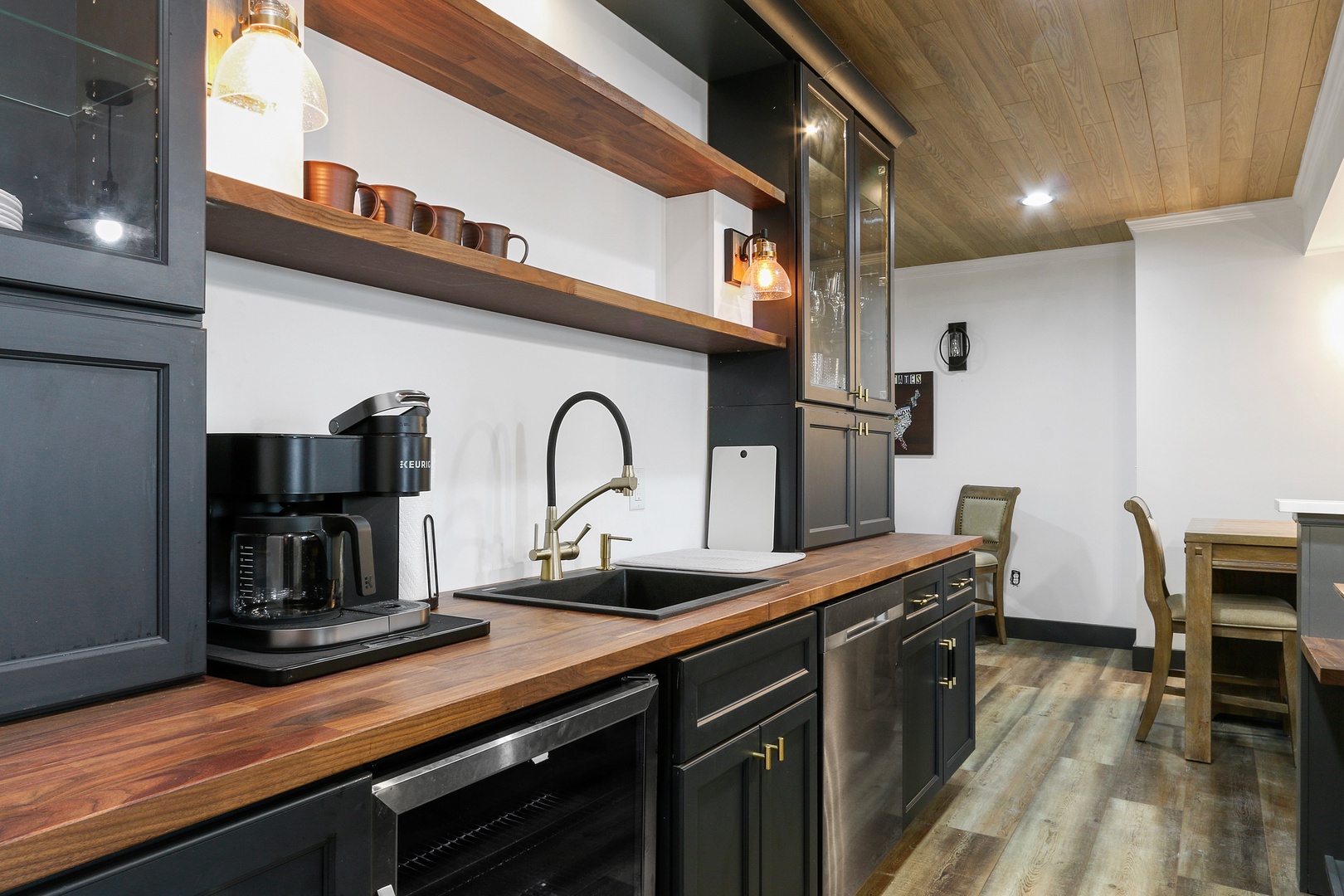 The luxurious primary suite (K) features a tray ceiling, fireplace, a large walk-in closet, and a deluxe bath with a jacuzzi tub and walk-in shower- a true relaxation zone. Two additional bedrooms (Q) on the main floor are adjoined by a convenient jack-and-jill bathroom, while the lower level hosts a secondary master suite (K), a kids room (no door, built-in bunk + twin), and a final bedroom (Q) with a shared attached bath. The proximity of a full bathroom relative to any given bedroom in this home is one of the attributes that sets it apart and makes vacationing at Lookout Lodge a breeze.