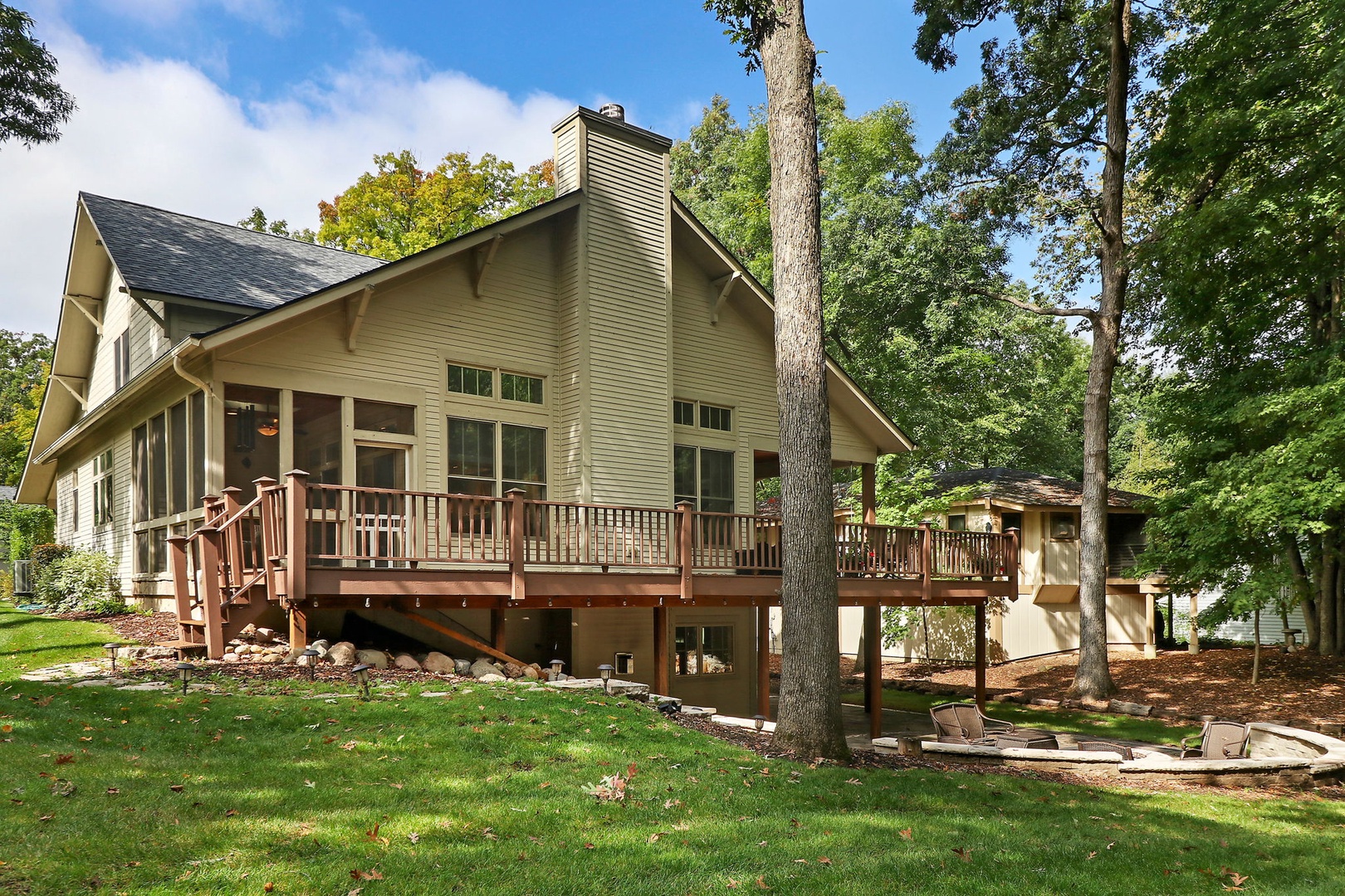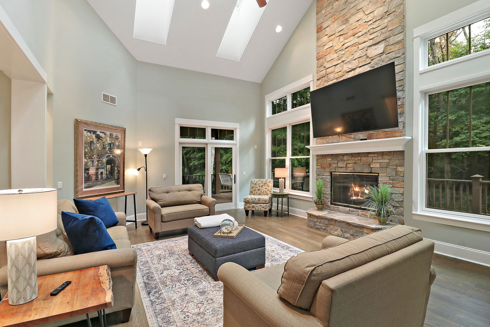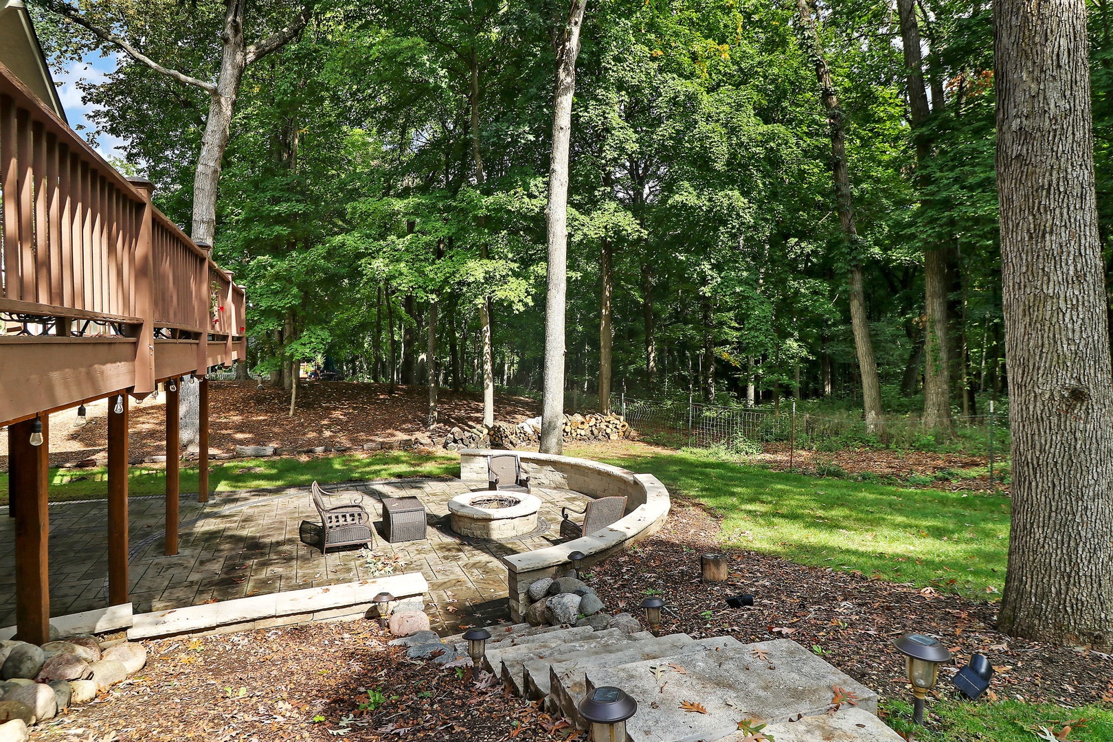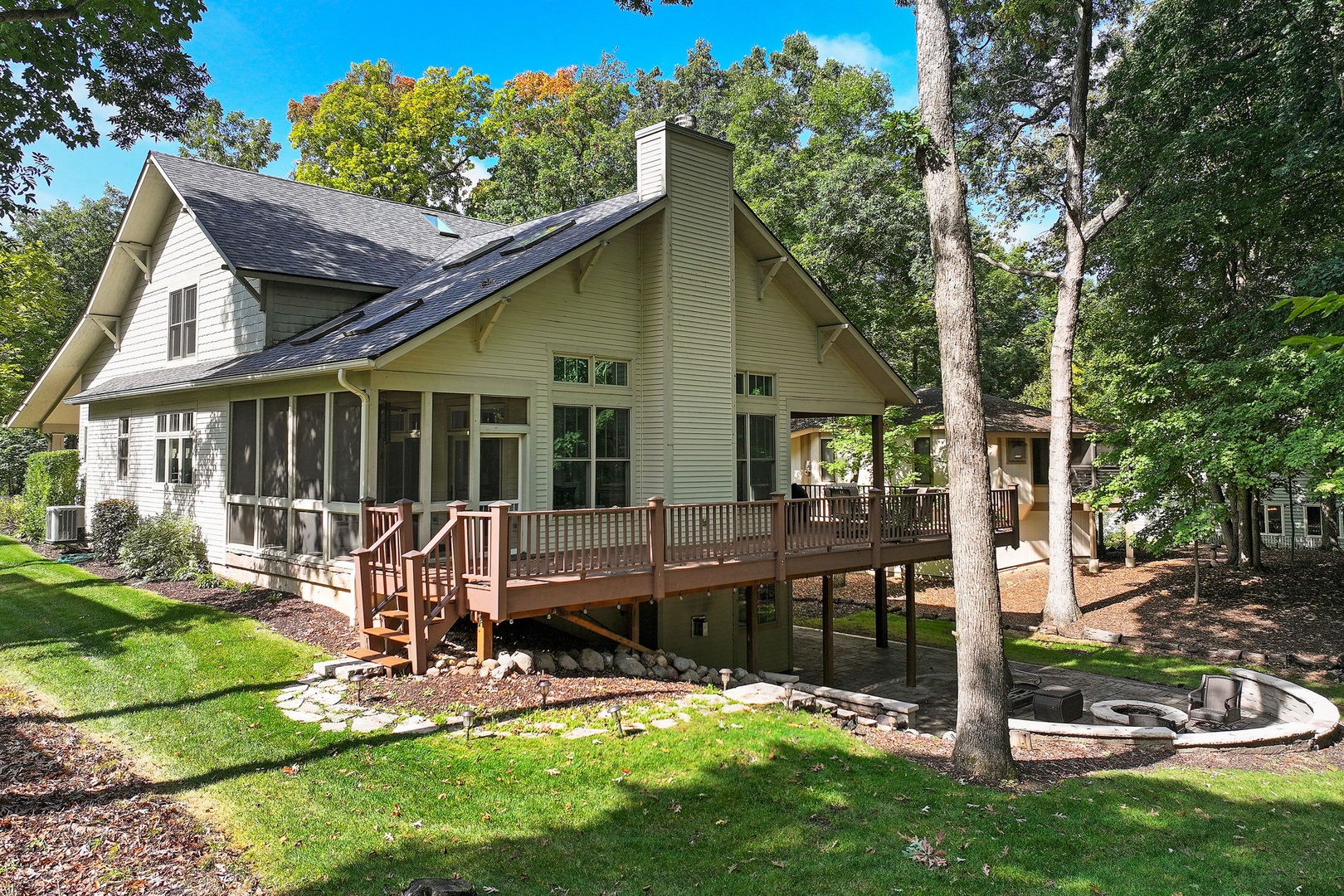 Step into a newly renovated space, featuring a brand new kitchen and a two-story family room. The backyard boasts a serene view of a deep wooded lot- it is very common to see a family of deer passing through! Stay cozy with three fireplaces and indulge in relaxation with a soaking tub in the first-floor master bedroom. Gather around the large fire pit for nighttime s'mores. Drive the golf cart to the beach, lake, or clubhouse for added convenience.