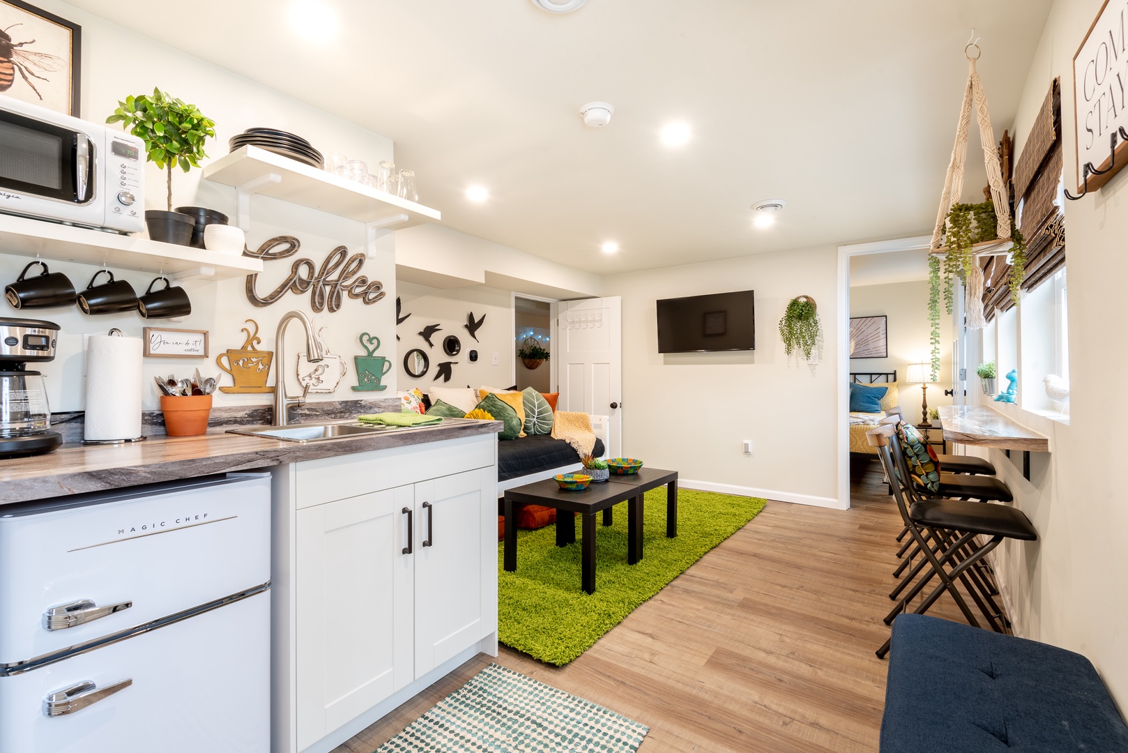 This carefully designed space brings the outdoors in with all the comforts of home. Featuring 3 bedrooms, 2 full baths, and a few extra sleeping spots in the two living areas, The Backyard accommodates 9 guests. BONUS: Balcony, coffee bar and private backyard for yard games and grilling. The uniqueness and convenience of this fun building will have you coming back year after year!